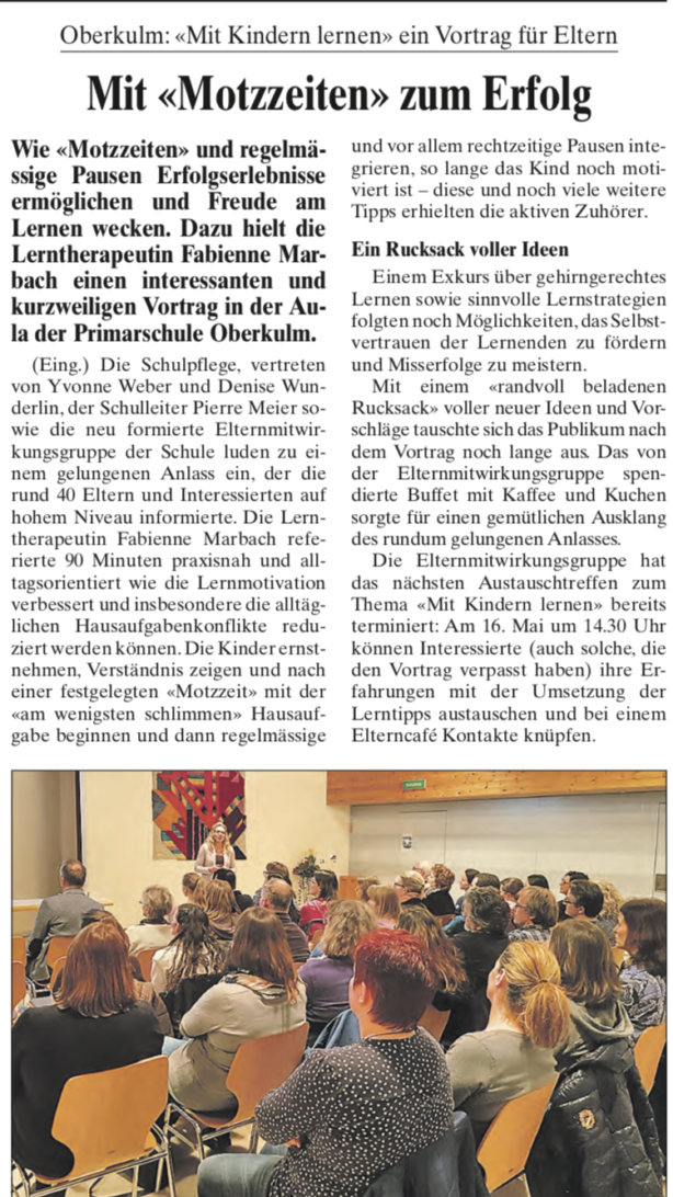 „Der Elternrat von unserem Primarschulhaus hat ein anderthalbstündiges Referat von Frau Marbach zum Thema „mit Kindern lernen“ für die Eltern der Schulkinder von der 1. bis 6. Klasse organisiert.